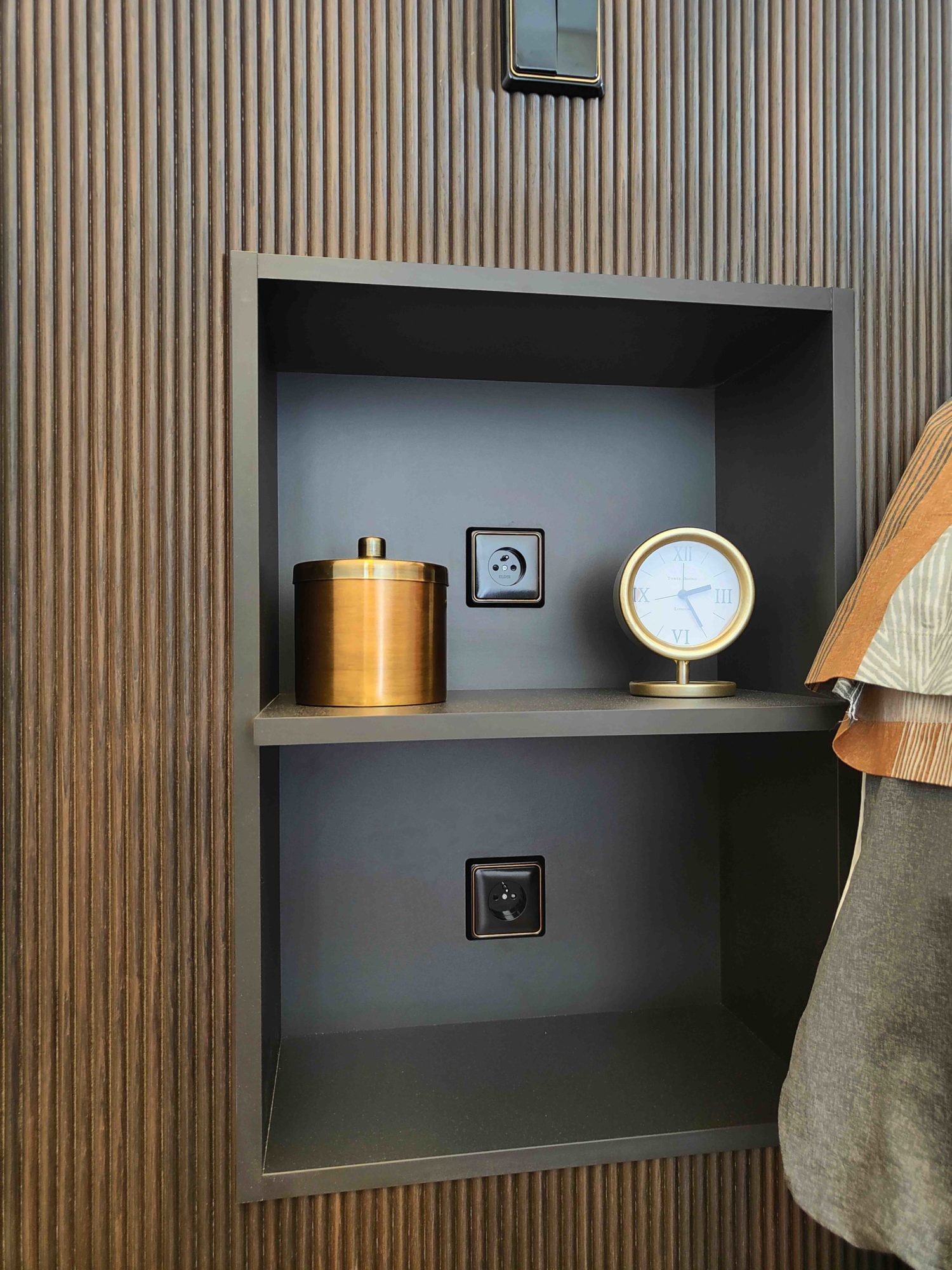 Éclairage Scénographique : Des sources lumineuses indirectes et variables pour passer d’une lumière fonctionnelle le matin à une ambiance tamisée et relaxante le soir.